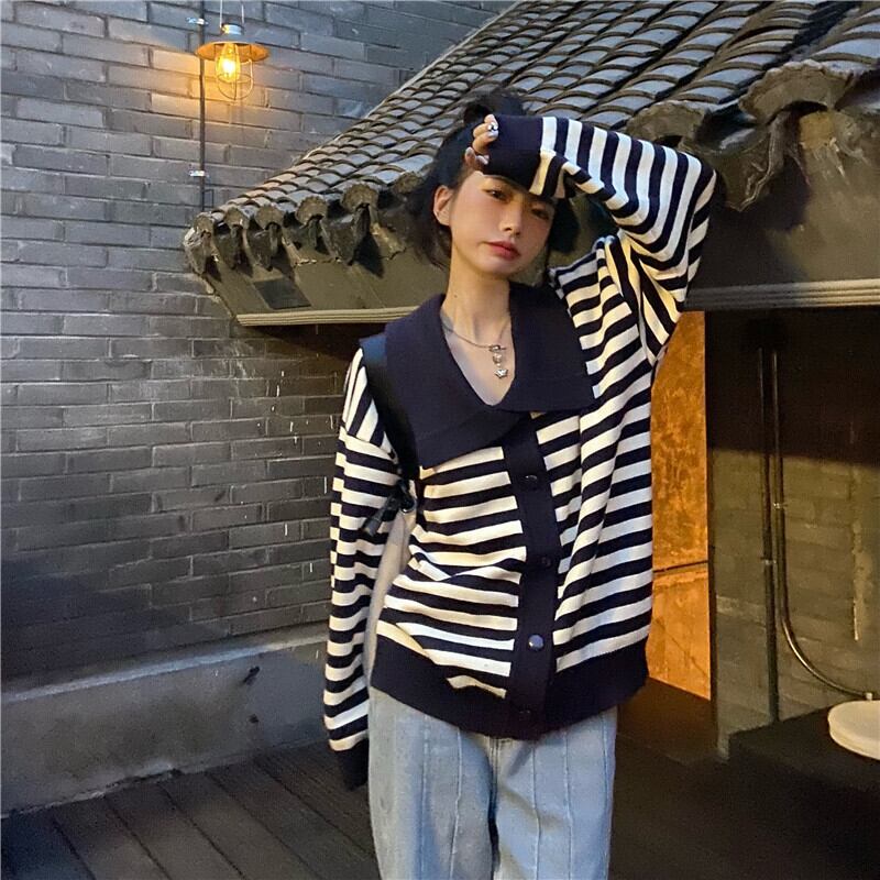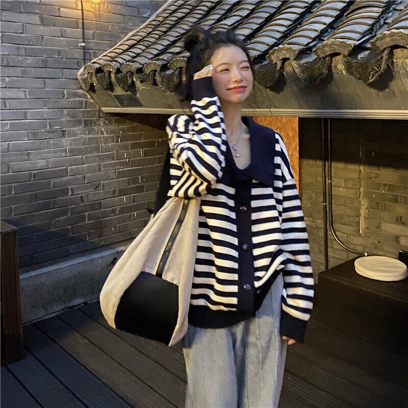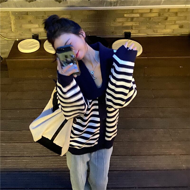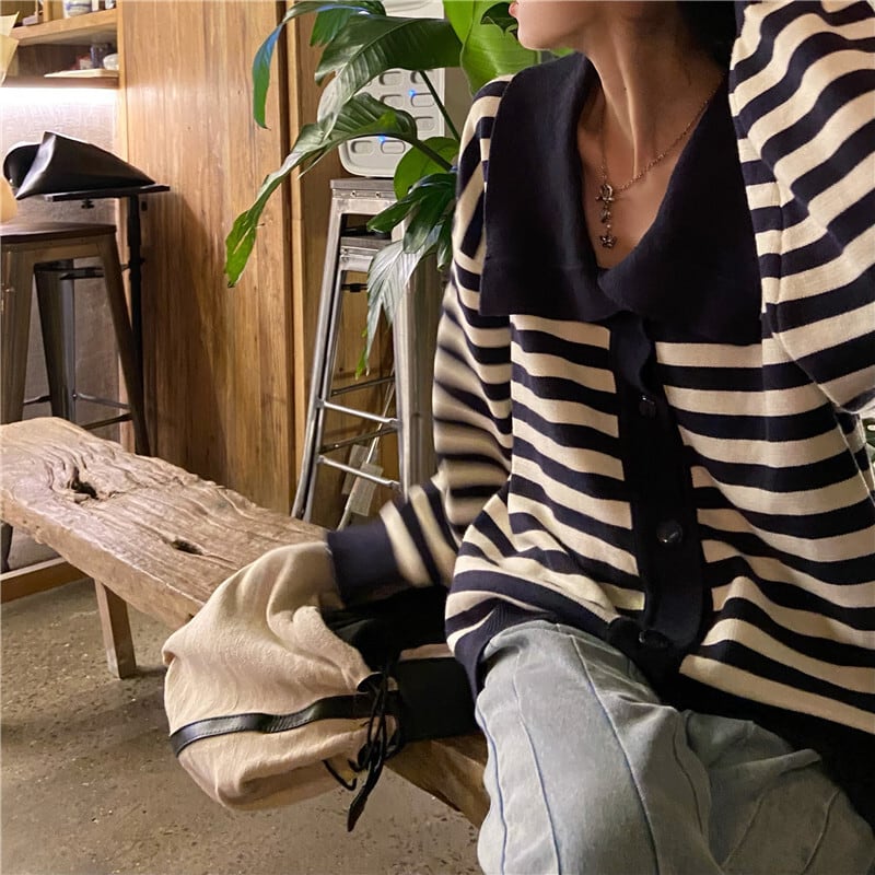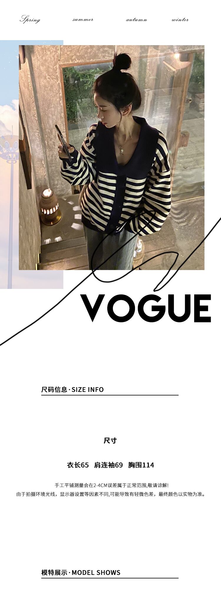 ストライプニットカーディガンオータム薄手セーター コート トップス ロング 秋物 モンロー66861291090