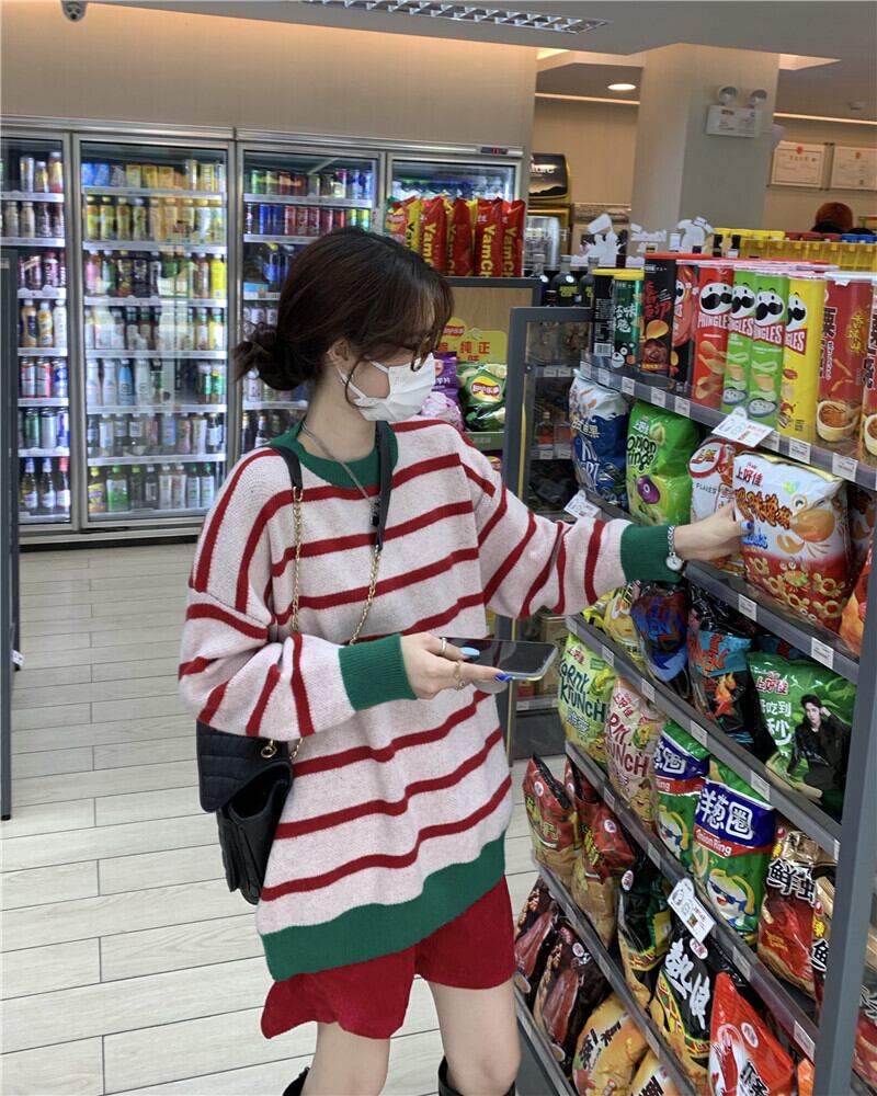 スタイルルーズストライプシャツ オータムカジュアルプルオーバー セーター コート ロング 秋物 モンロー47748517033