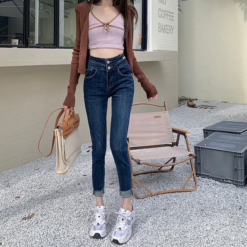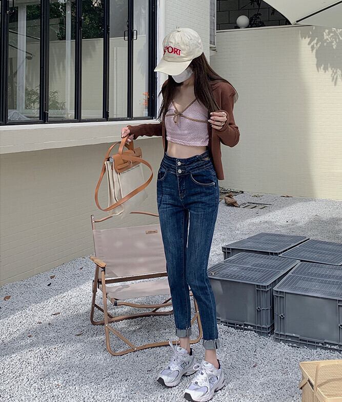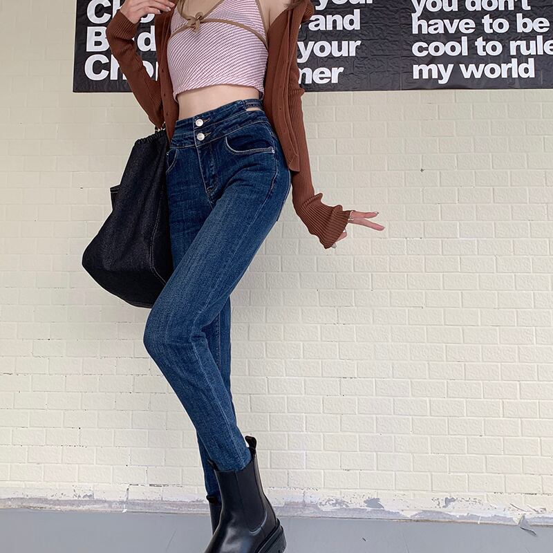 スリムダークブルージーンズ スプリングオータムハイウェストパンツ 春物 秋物 モンロー72982405165