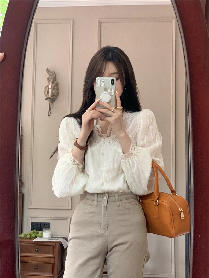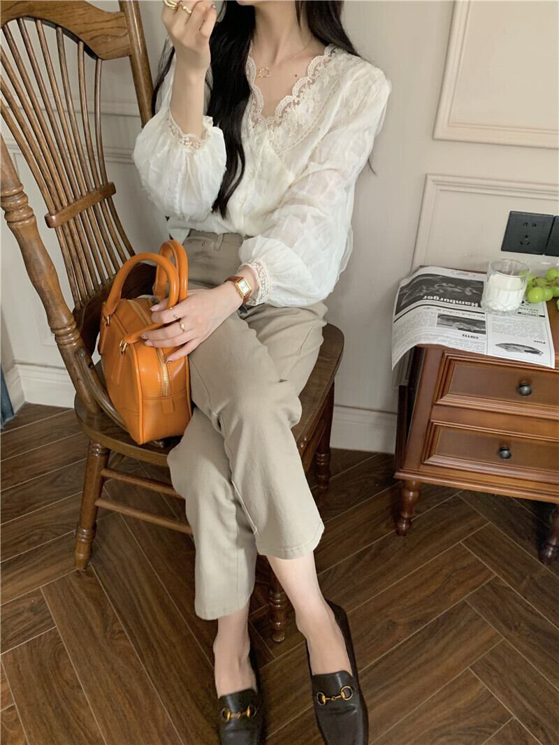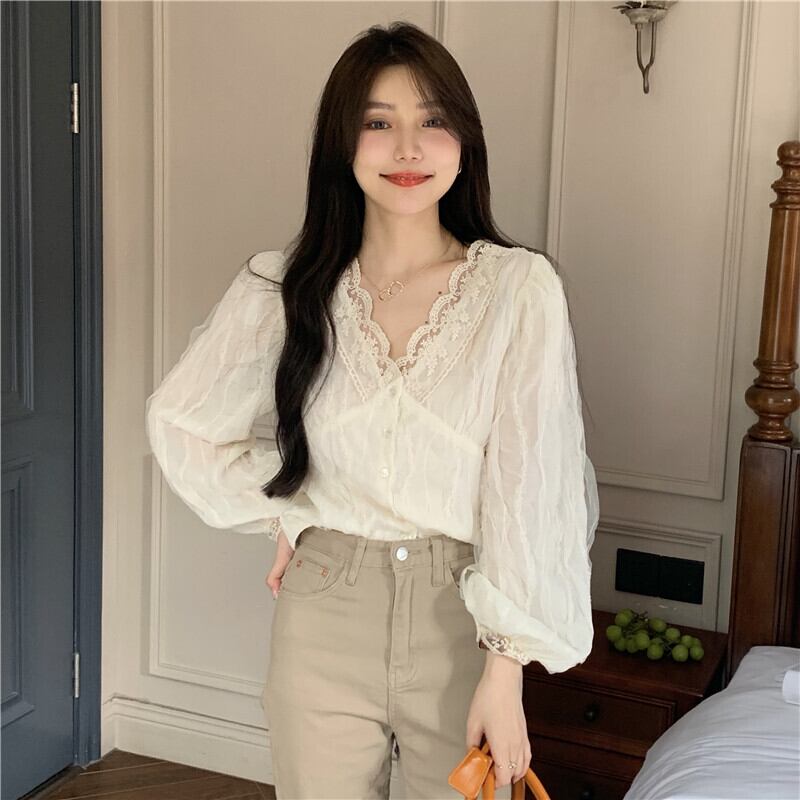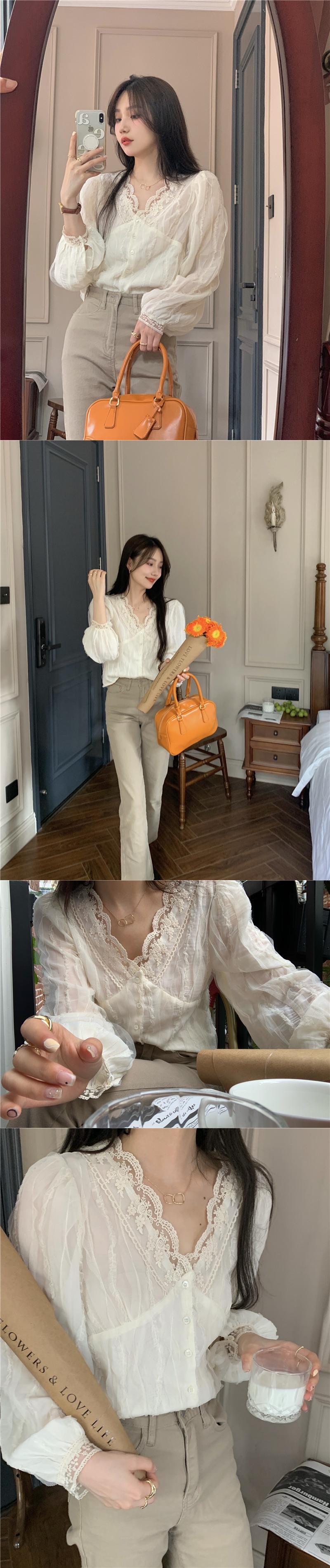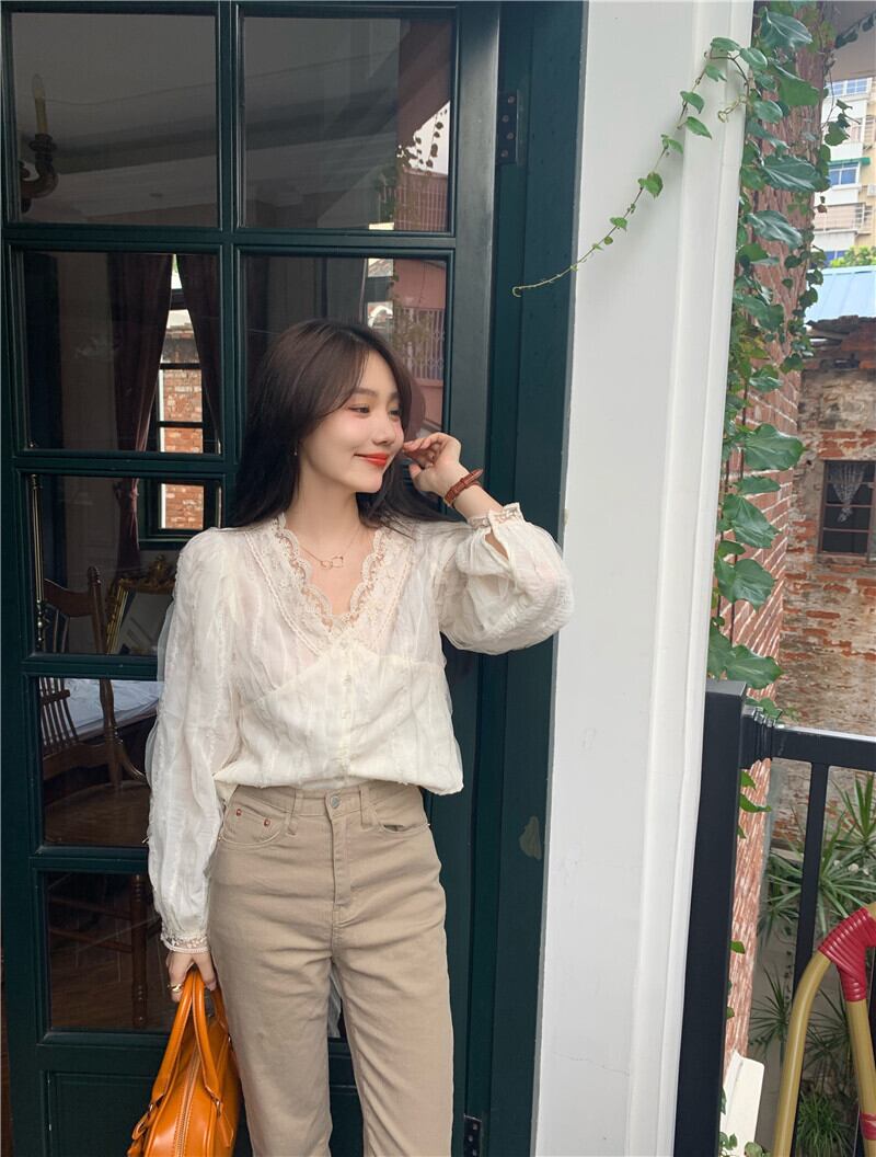 Vネックシャツ オータムレースブラウス ロング 秋物 ステッチ モンロー76684797638