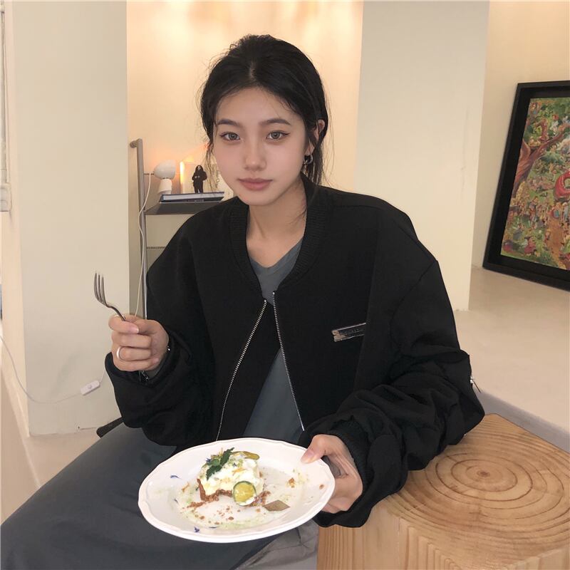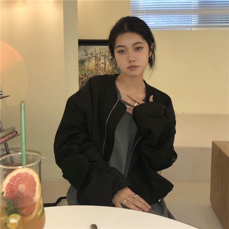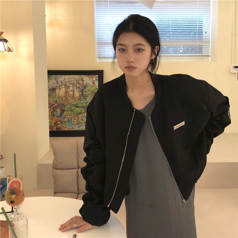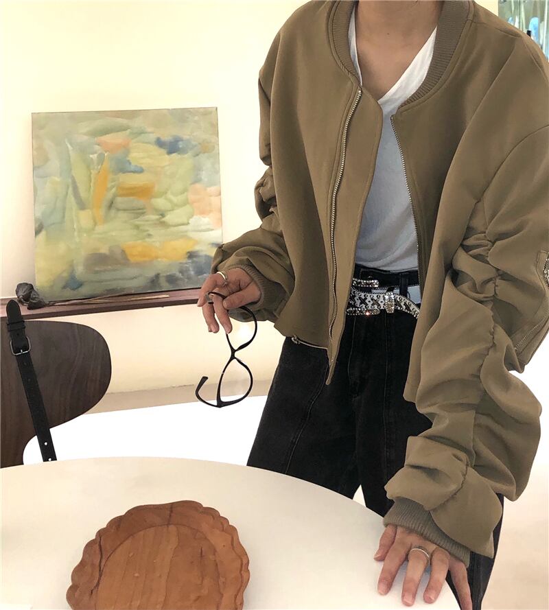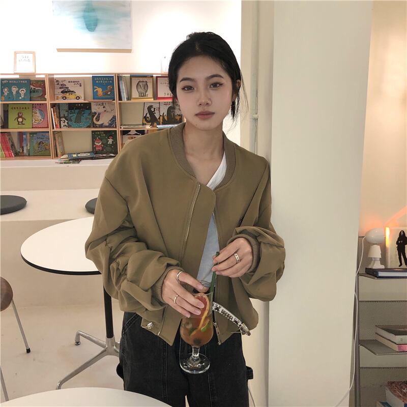 カーキショート長袖スリーブジャケット オータムジッパートップス ロング 秋物 モンロー75071998315