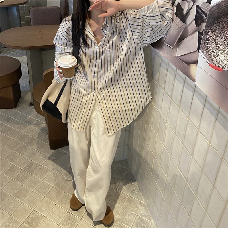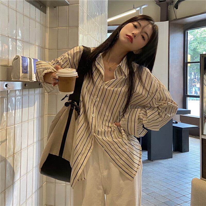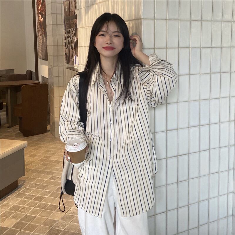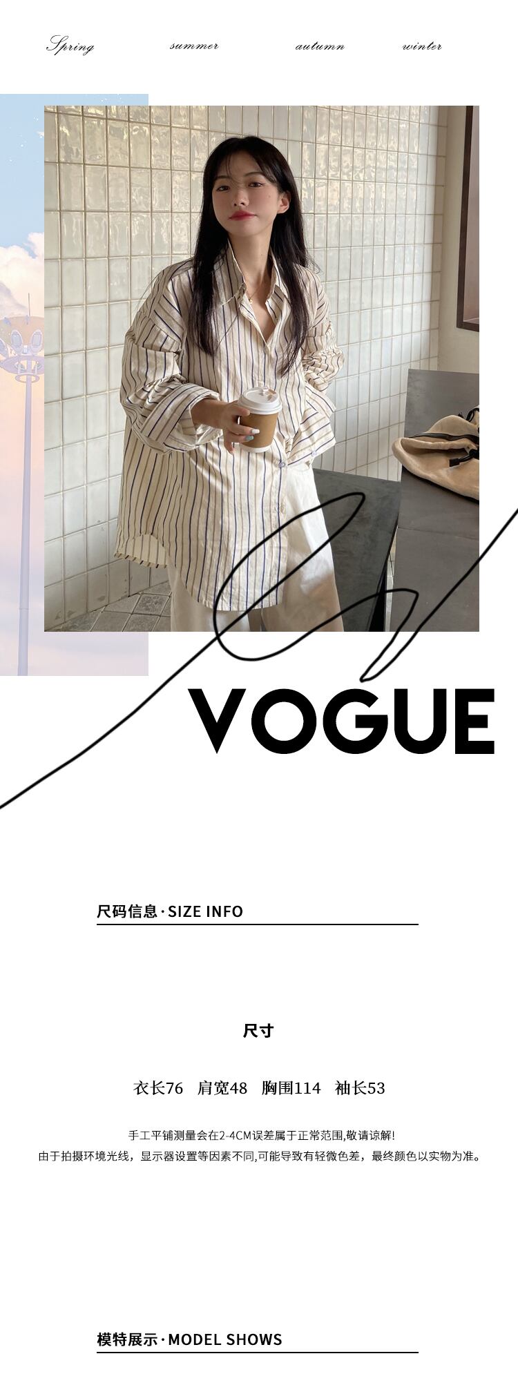 ルーズシャツ オータムストライプスタンダードスタイルジャケット ロング レトロ 秋物 モンロー55387512305