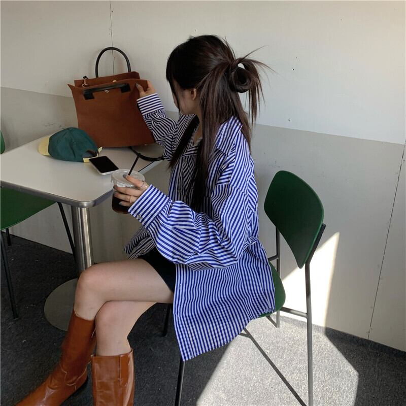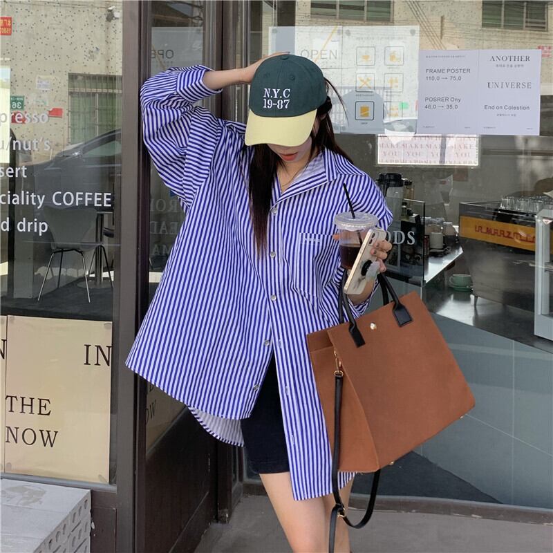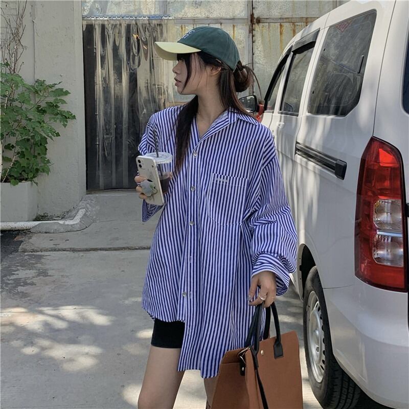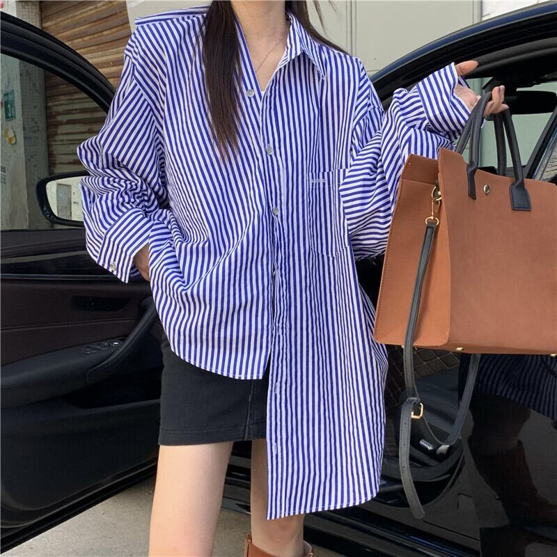 ルーズストライプシャツ オータムトップス ロング 秋物 モンロー24669510172