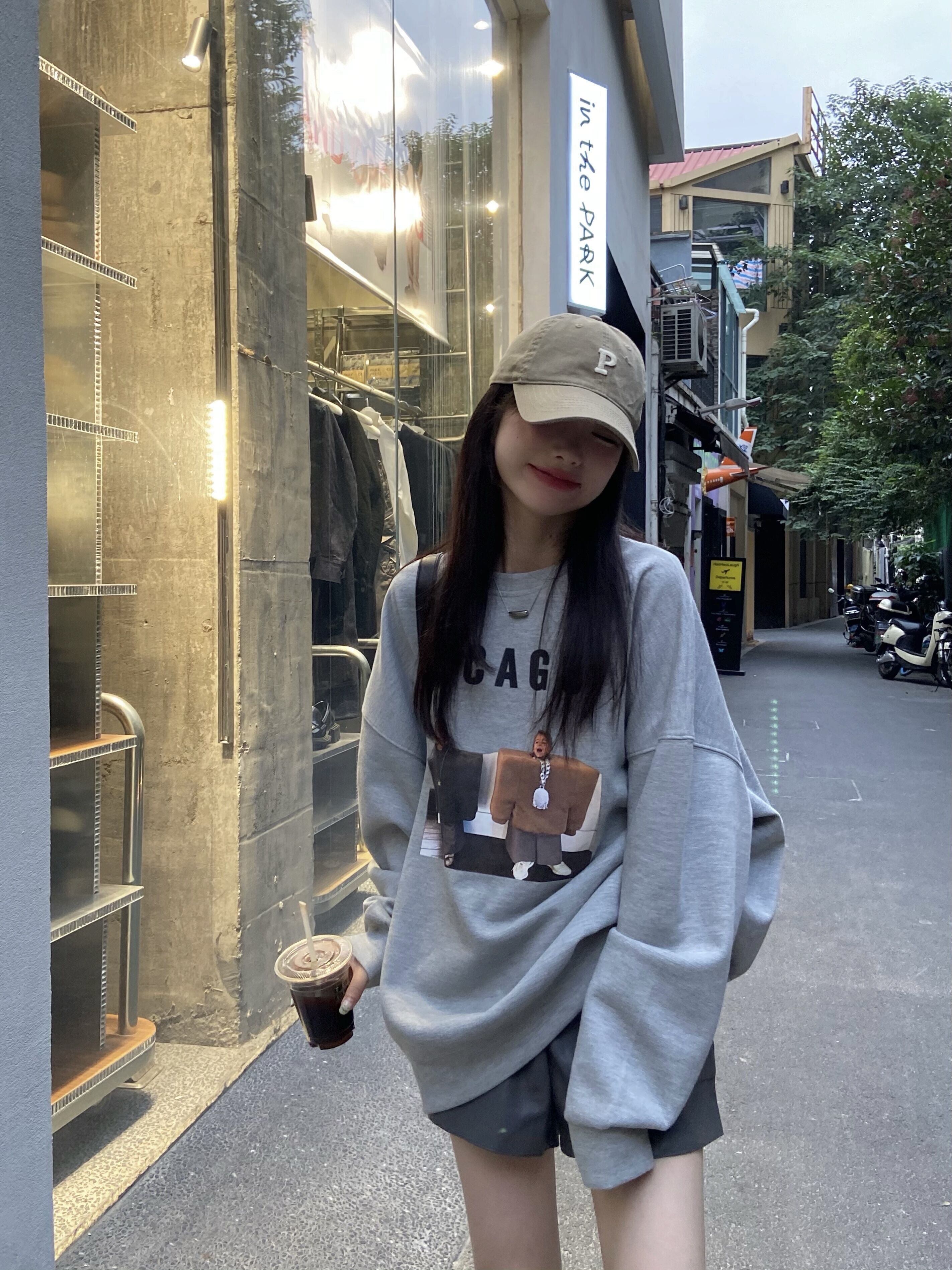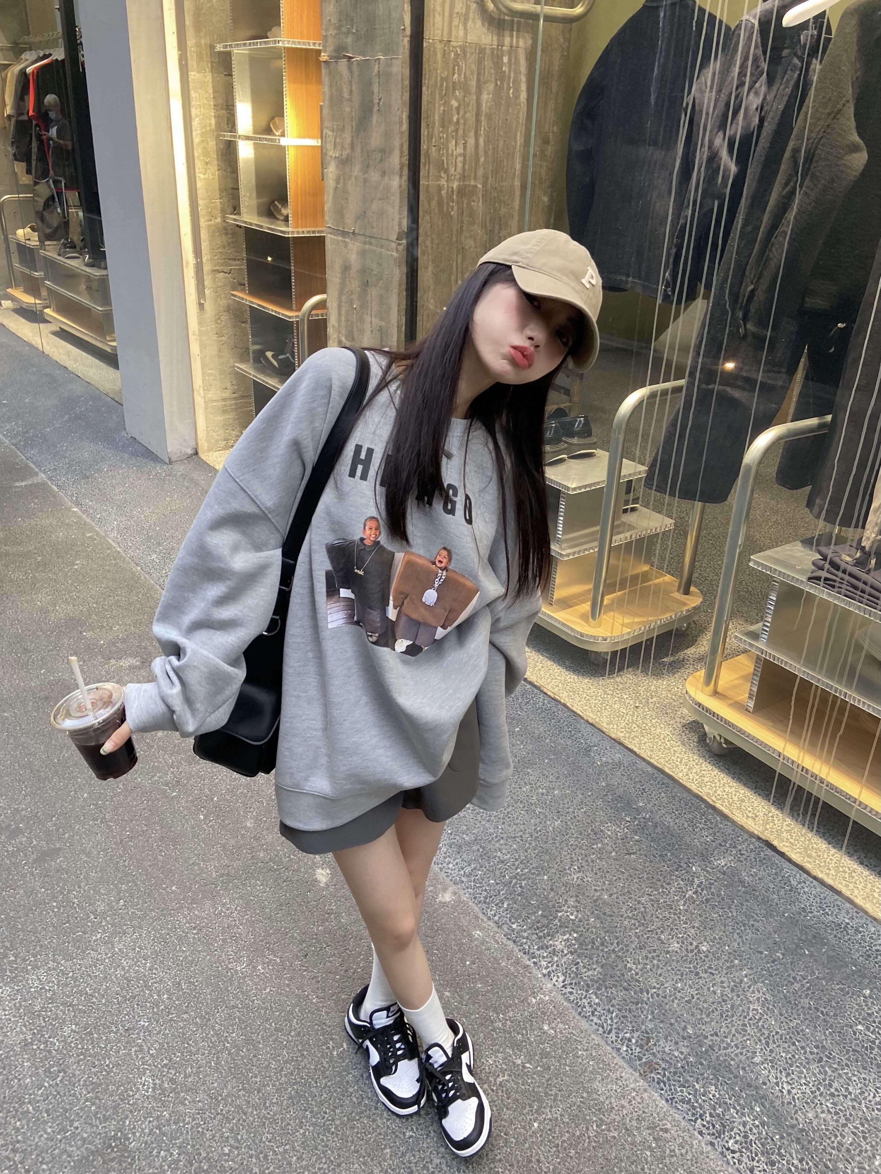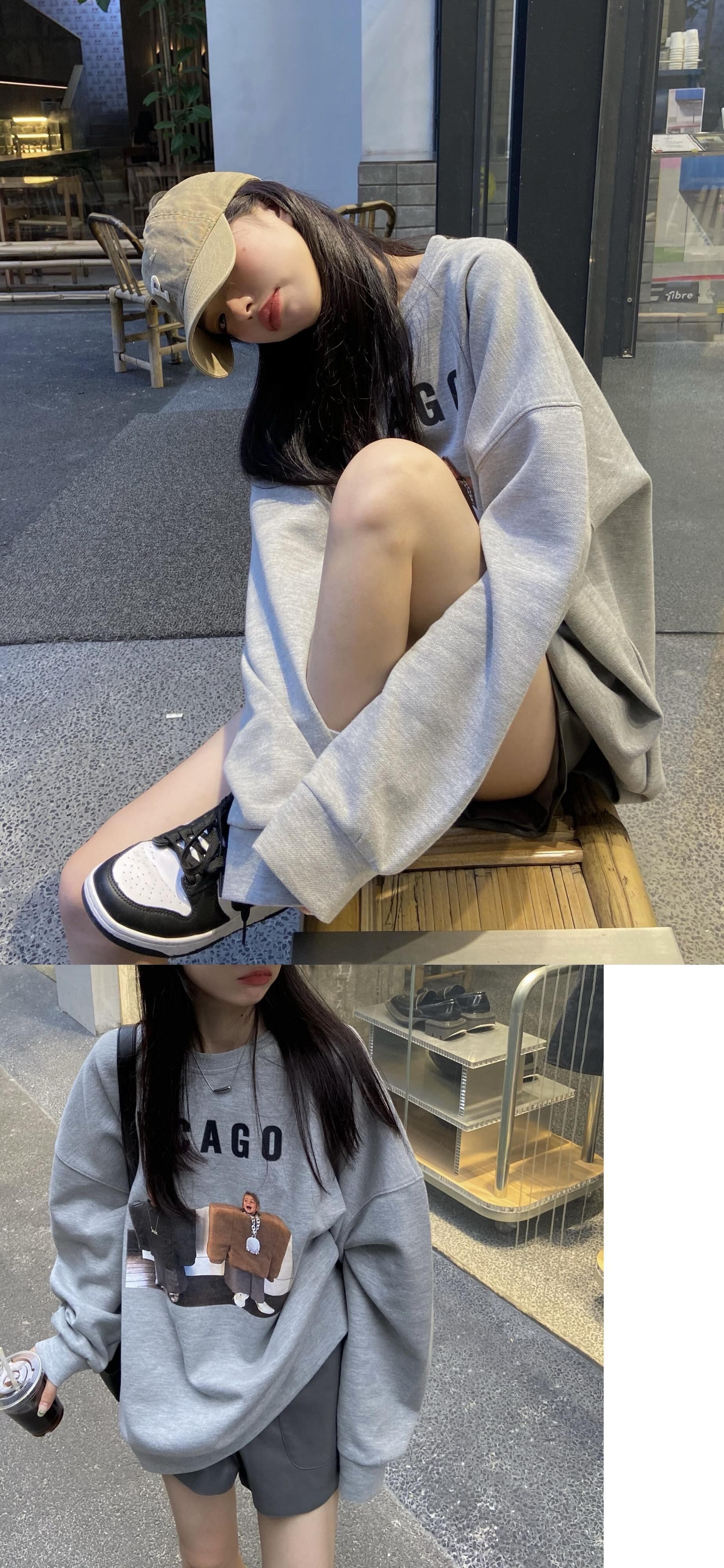 オータム薄手プリントルーズセーター ハイウェストレザーショーツ 秋物 ブルマー モンロー64417138786