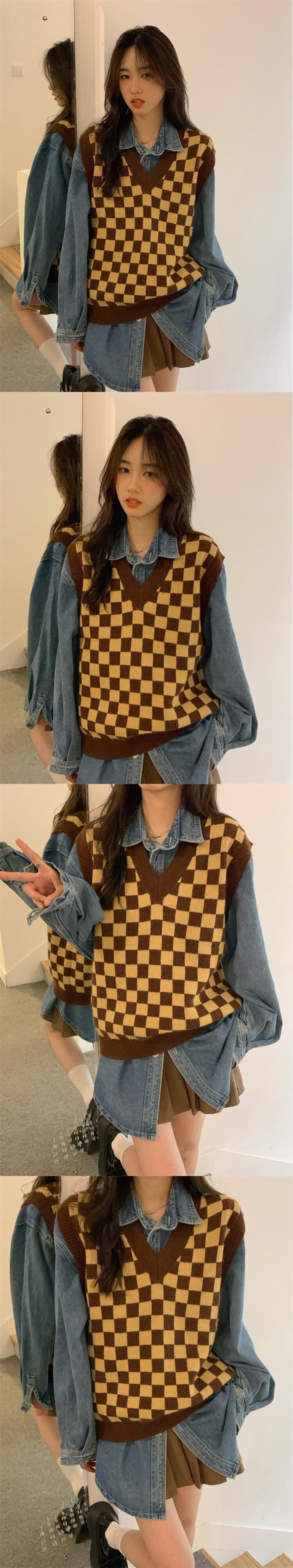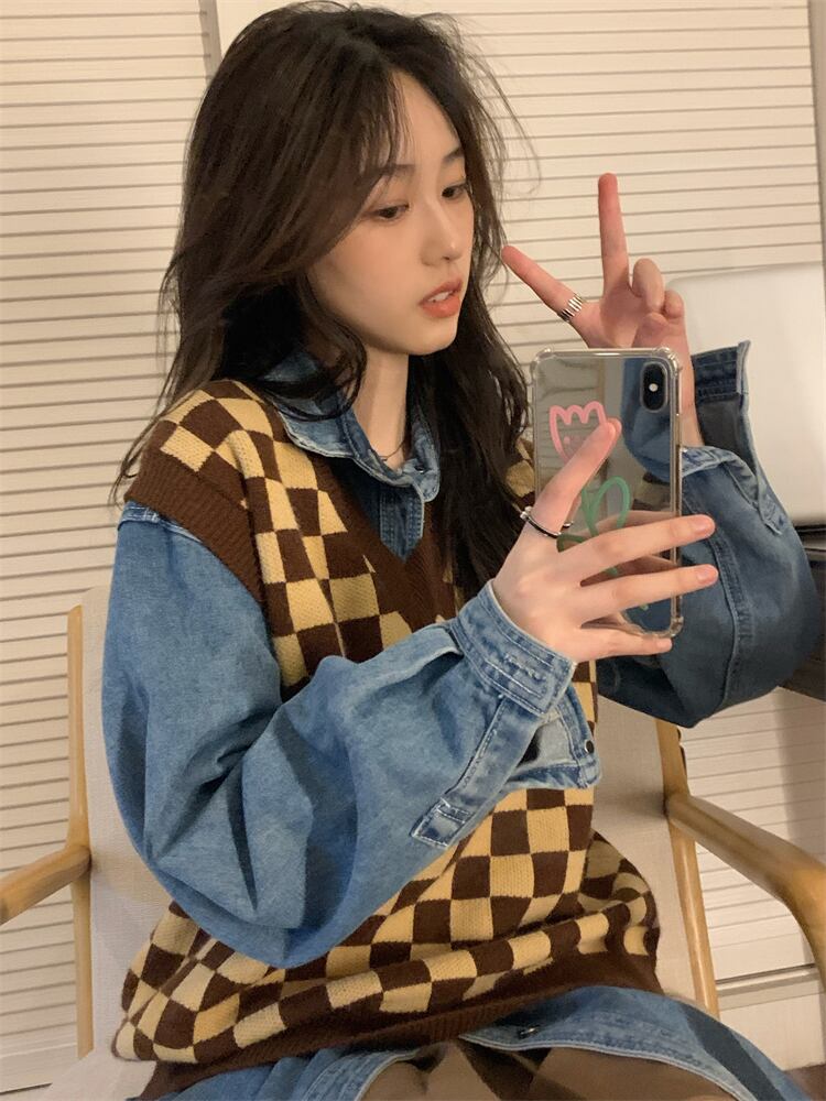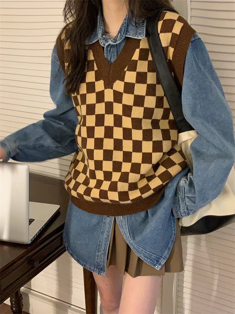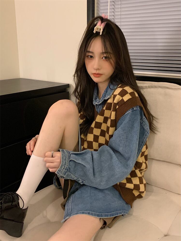 色:コーヒーチェックベスト,デニムシャツ,カードカラープリーツスカート(S),カードカラープリーツスカート(M),カードカラープリーツスカート(L)