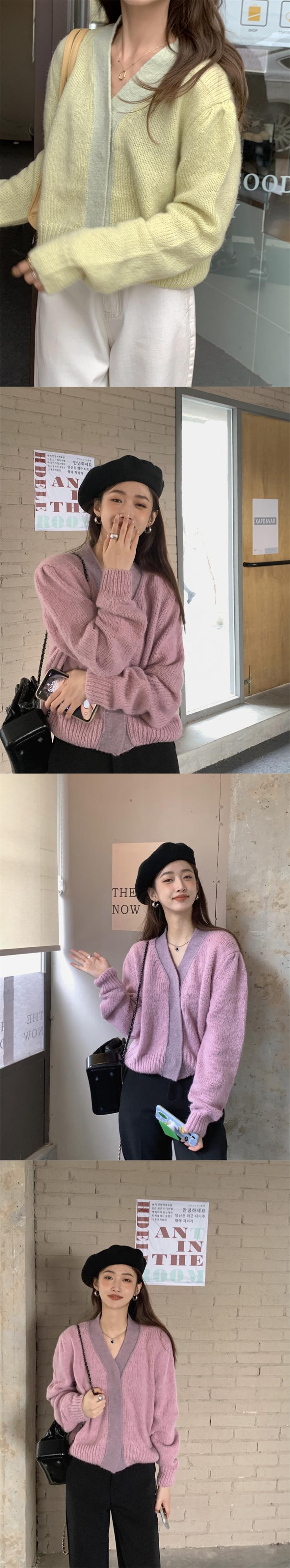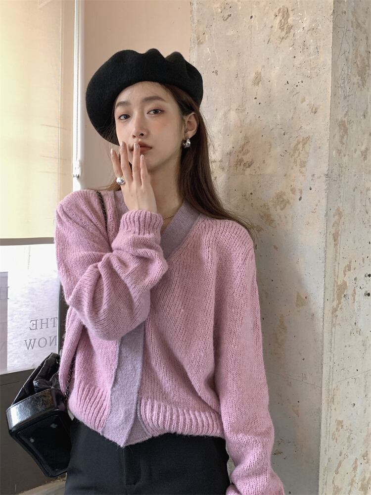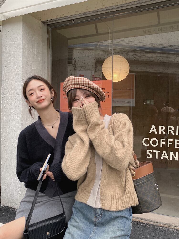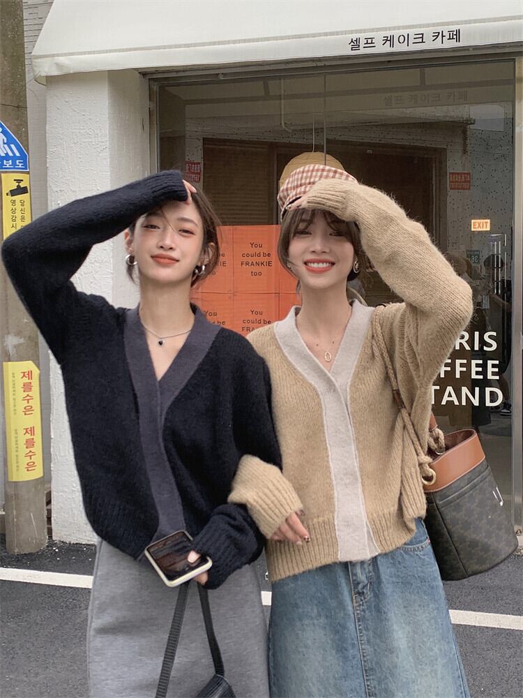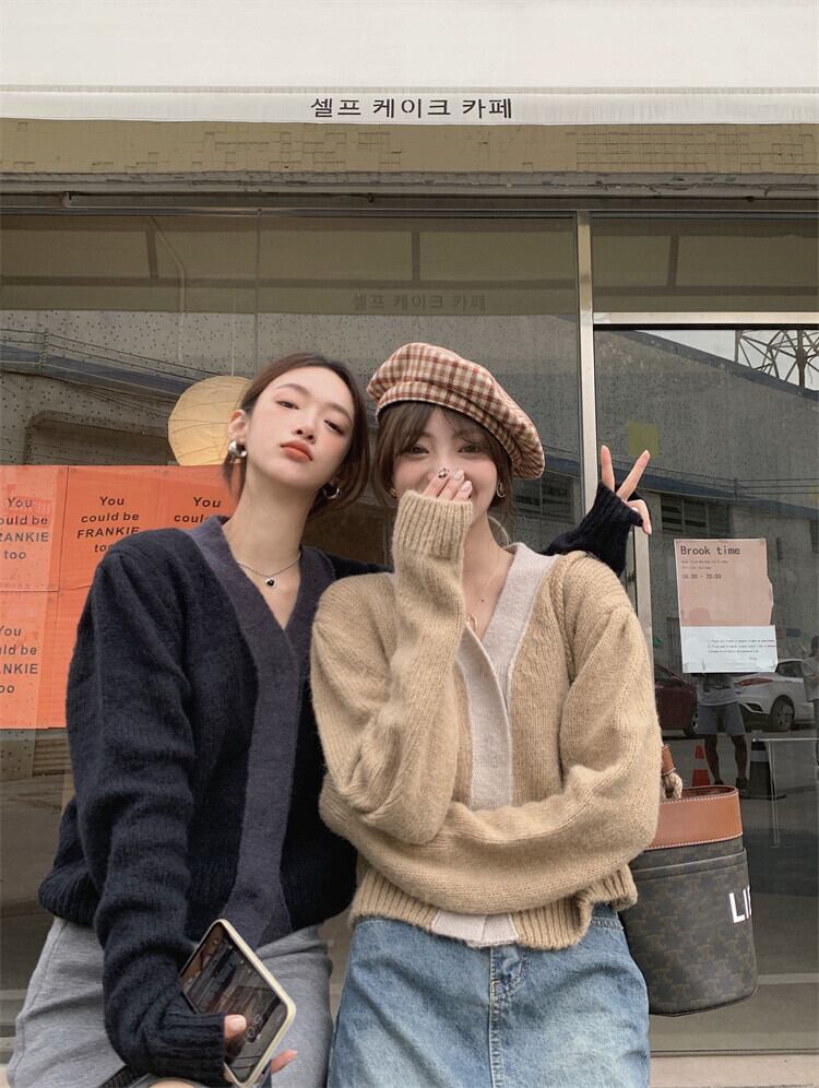 スタンダードルーズニットセーター オータムVネックカーディガントップス ロング レトロ 秋物 モンロー64161175857