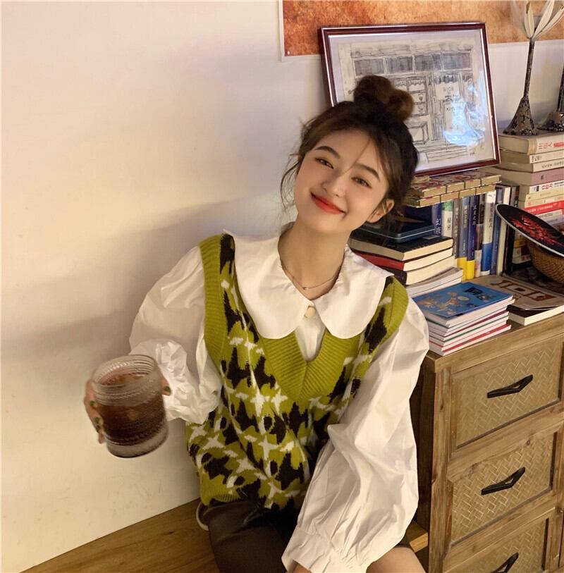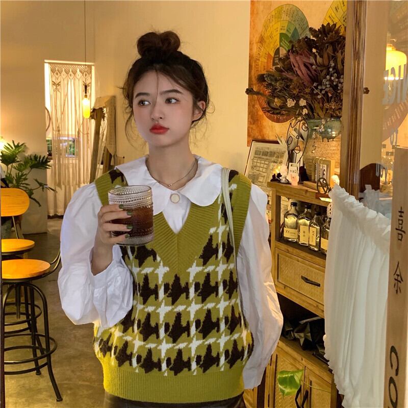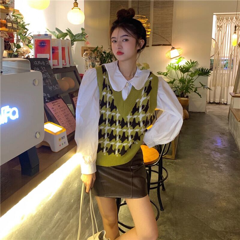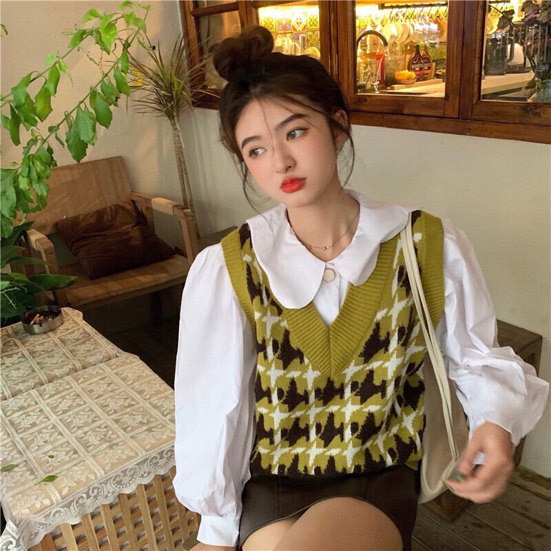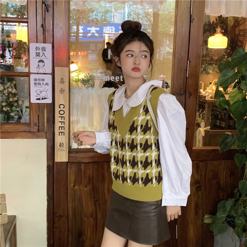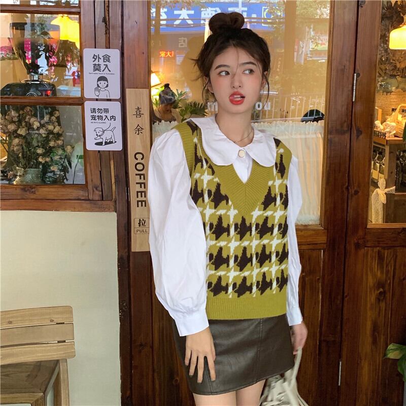色:人形の襟の白いシャツ,Vネックチェック柄ベスト