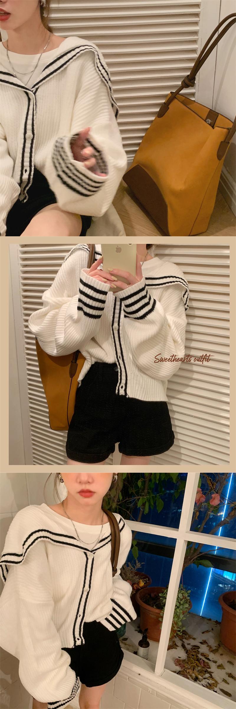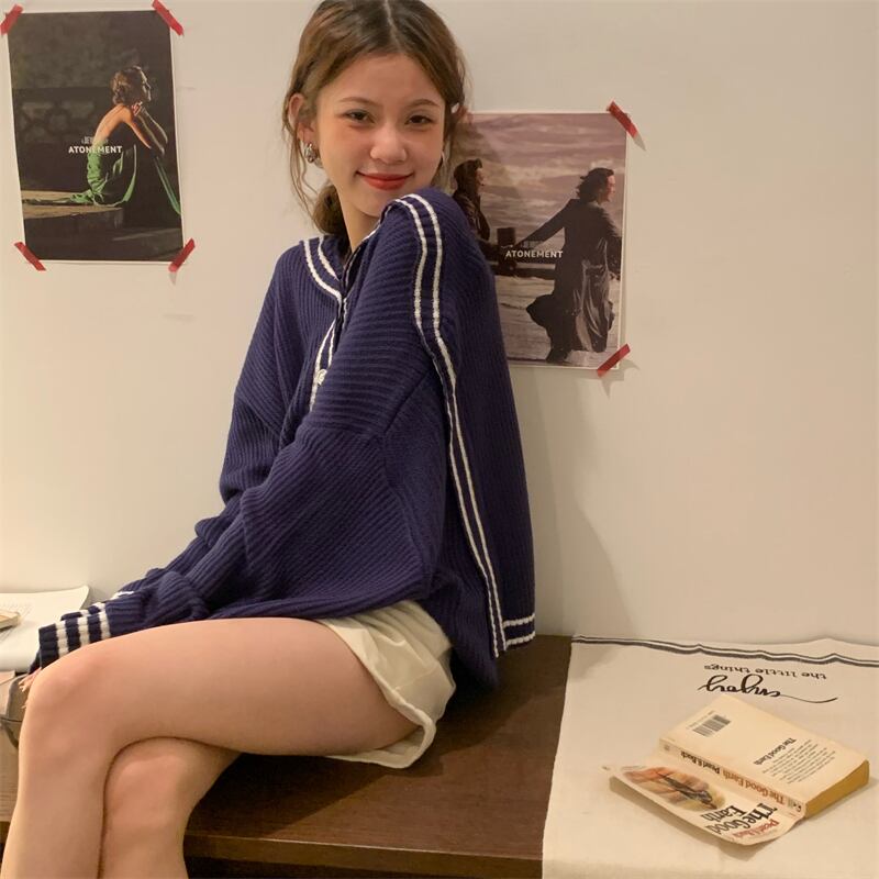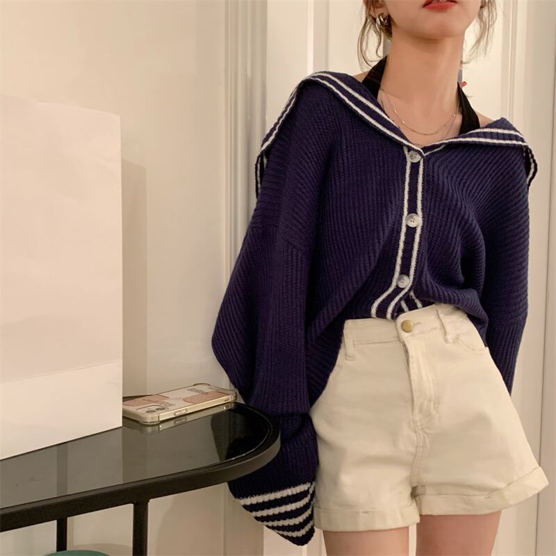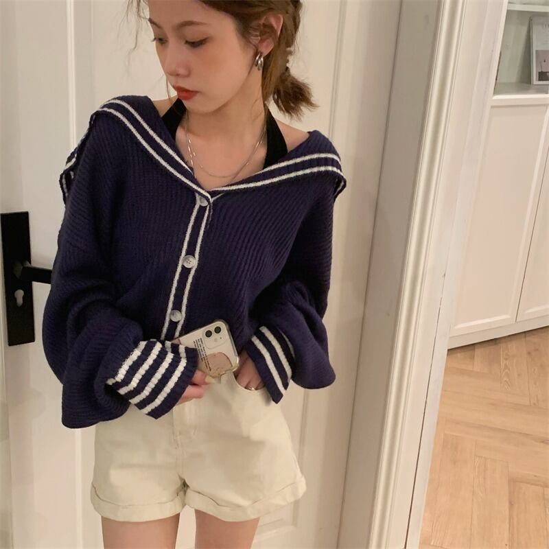 スタイルショートネイビーカラーニットカーディガンルーズセーター コート オータムベージュトップス 秋物 モンロー8665878948