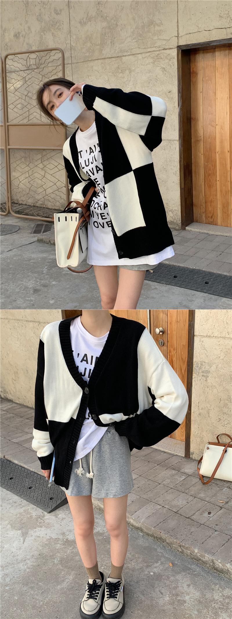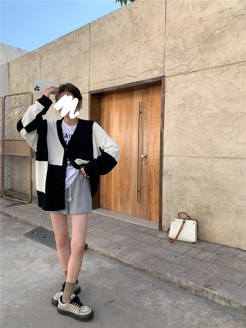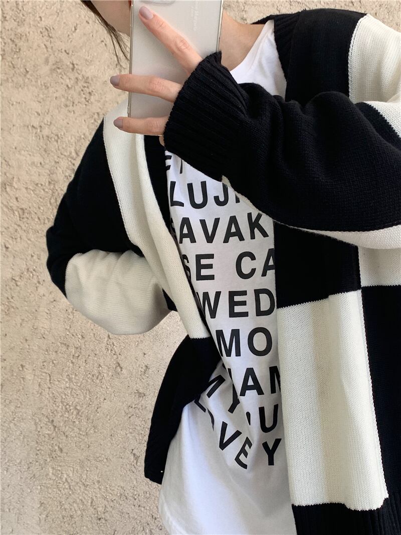 スタイルブラックホワイト格子柄セーター オータムルーズカーディガントップス ロング 秋物 モンロー75029290927