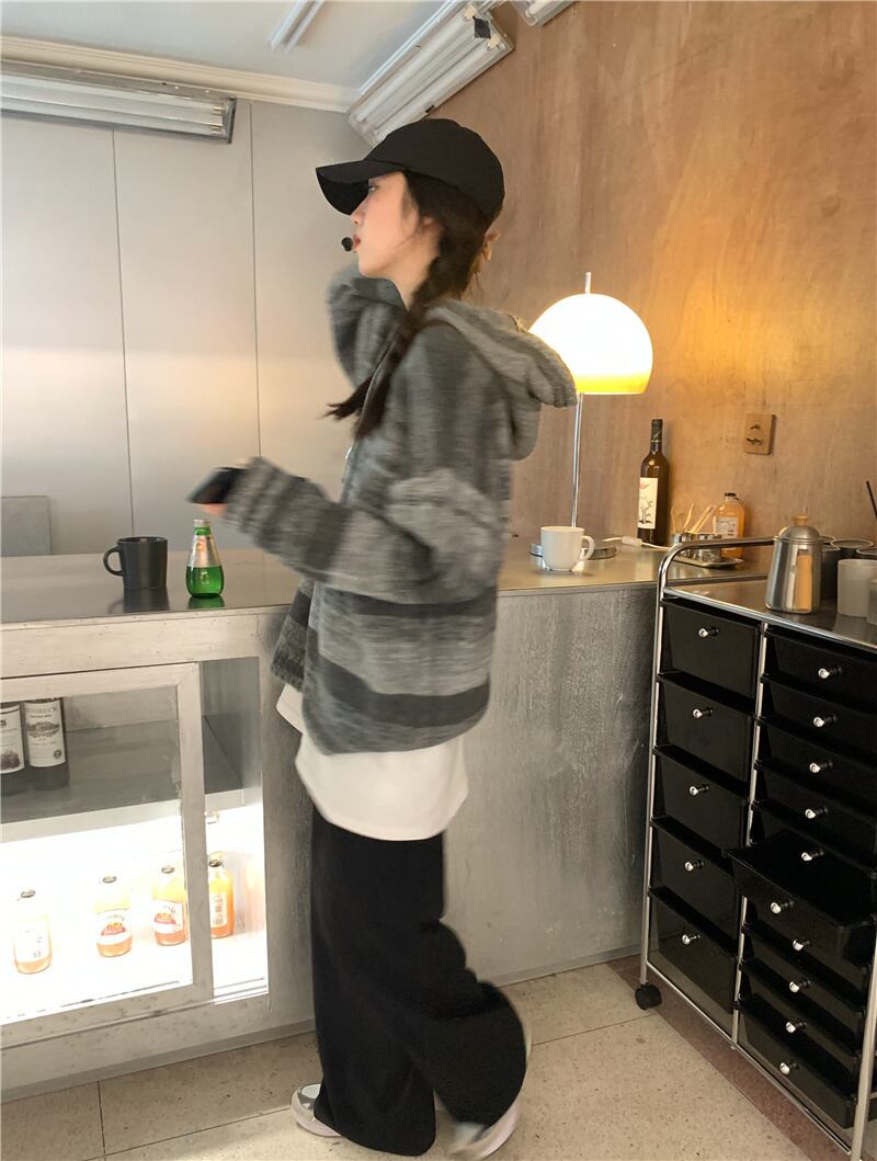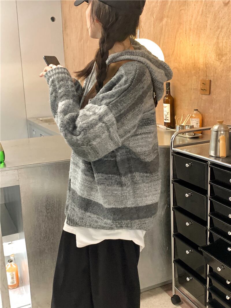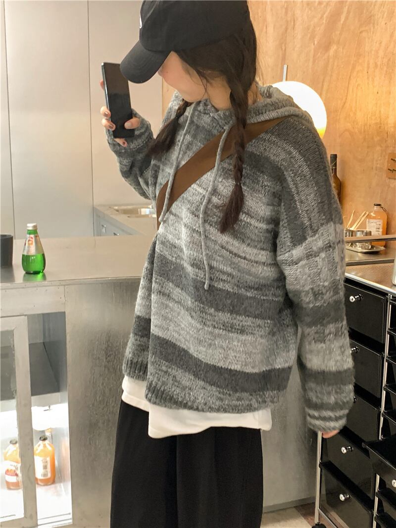 ストライプフードニット オータム薄手ルーズセーター ジャケット スタンダードトップス レトロ 秋物 モンロー80496361202