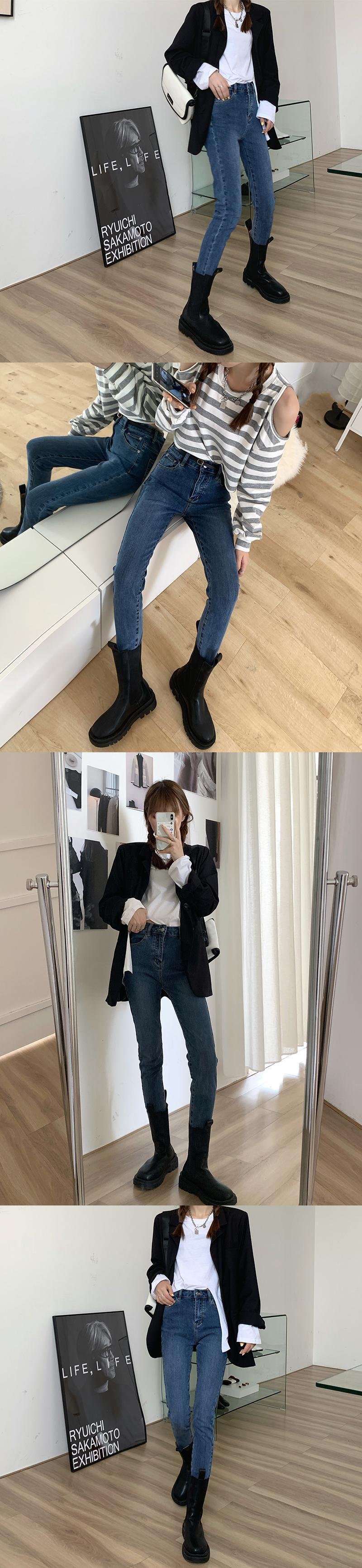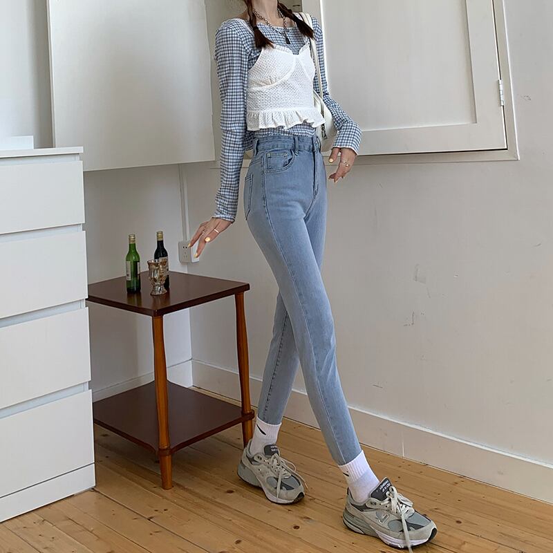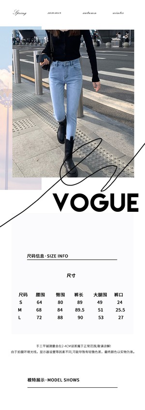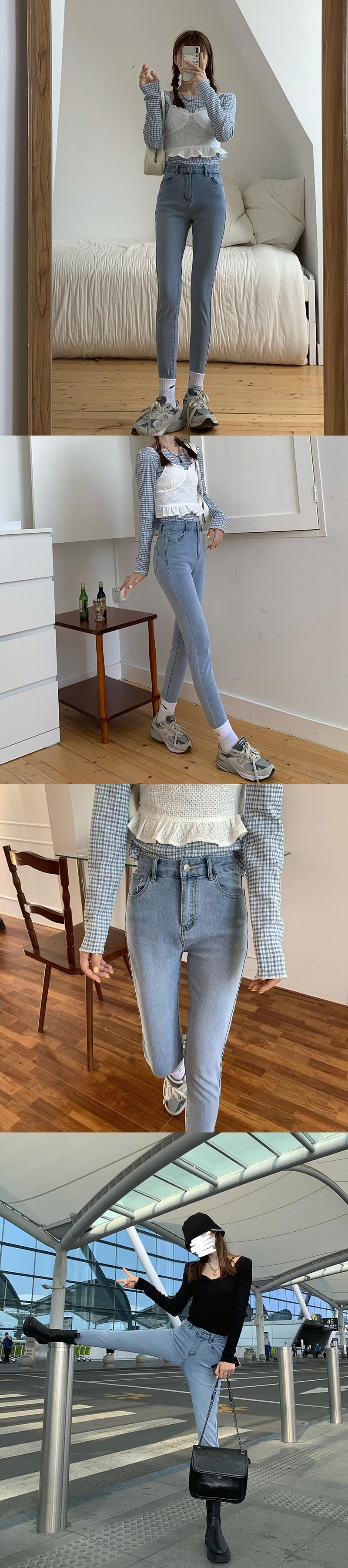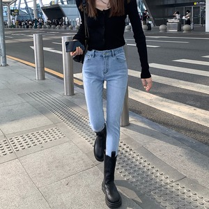 ブルーハイウェストウェストスリムクロップドジーンズ スプリングオータム薄手パンツ 春物 秋物 モンロー74360857562