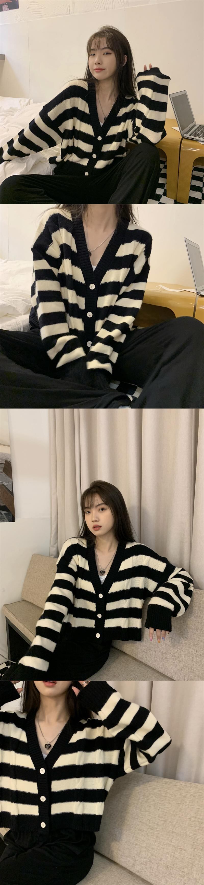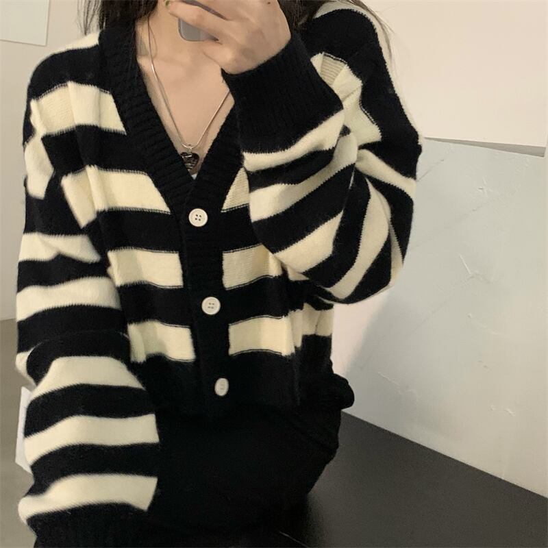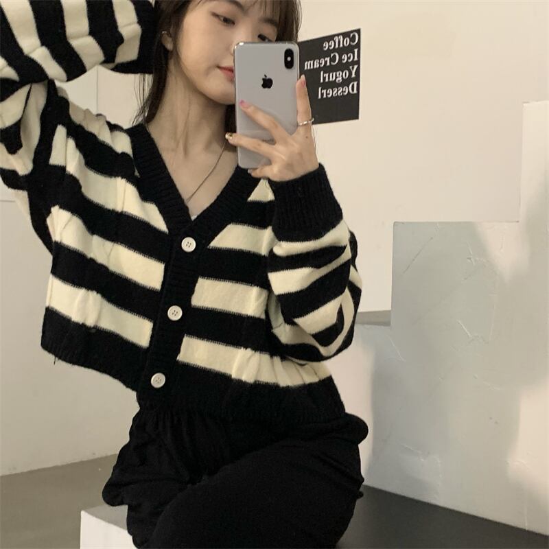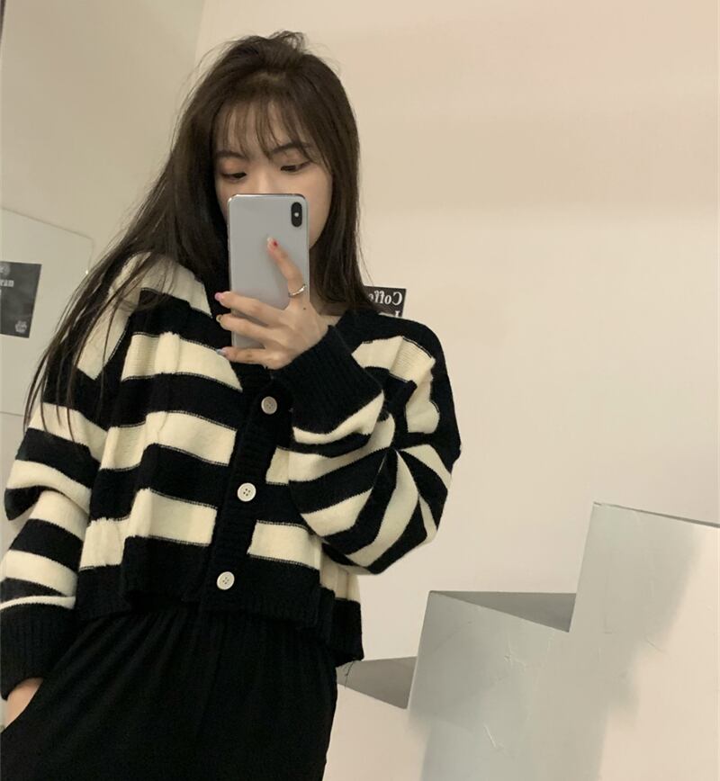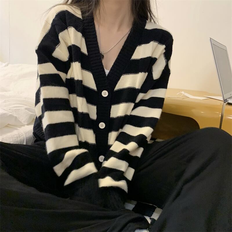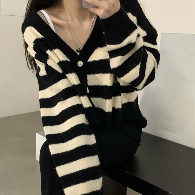 スタイルVネックストライプニットカーディガンオータム薄手セーター コート クロップドトップス ロング 秋物 モンロー8524996176