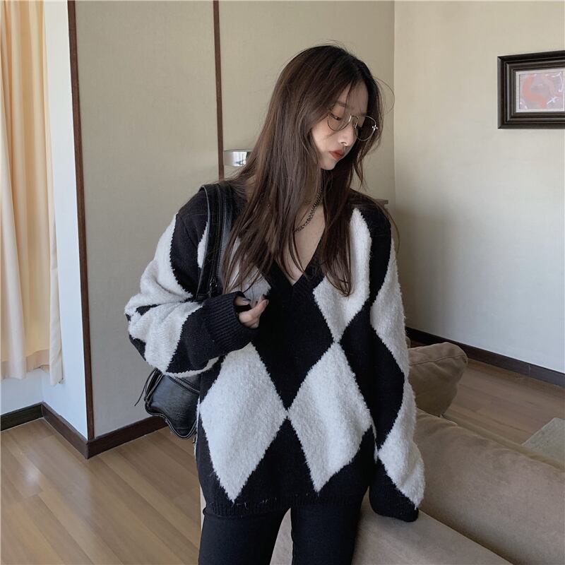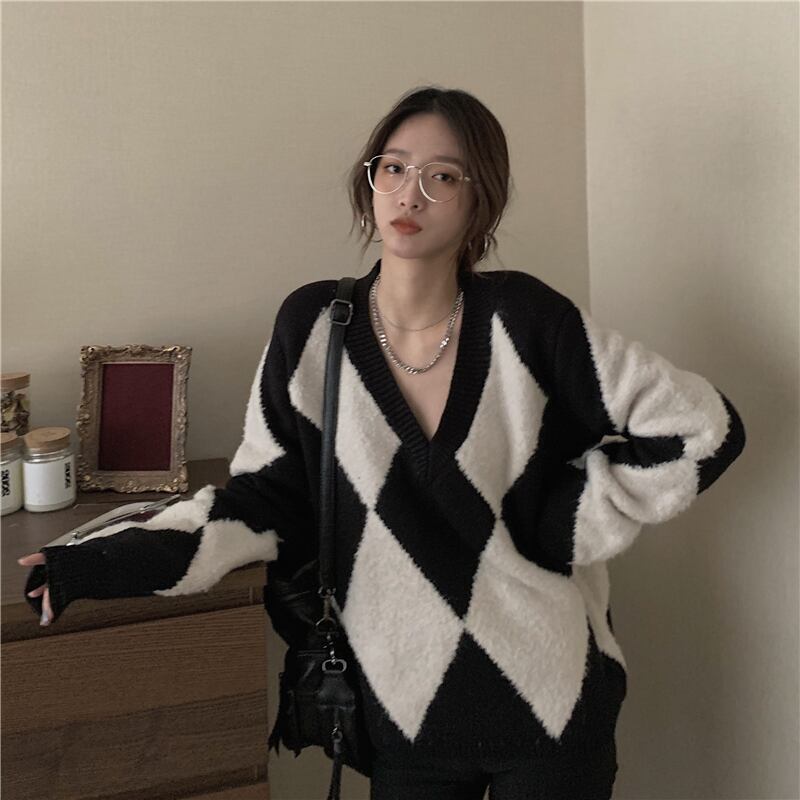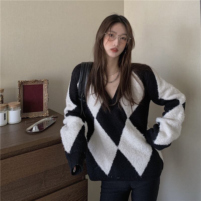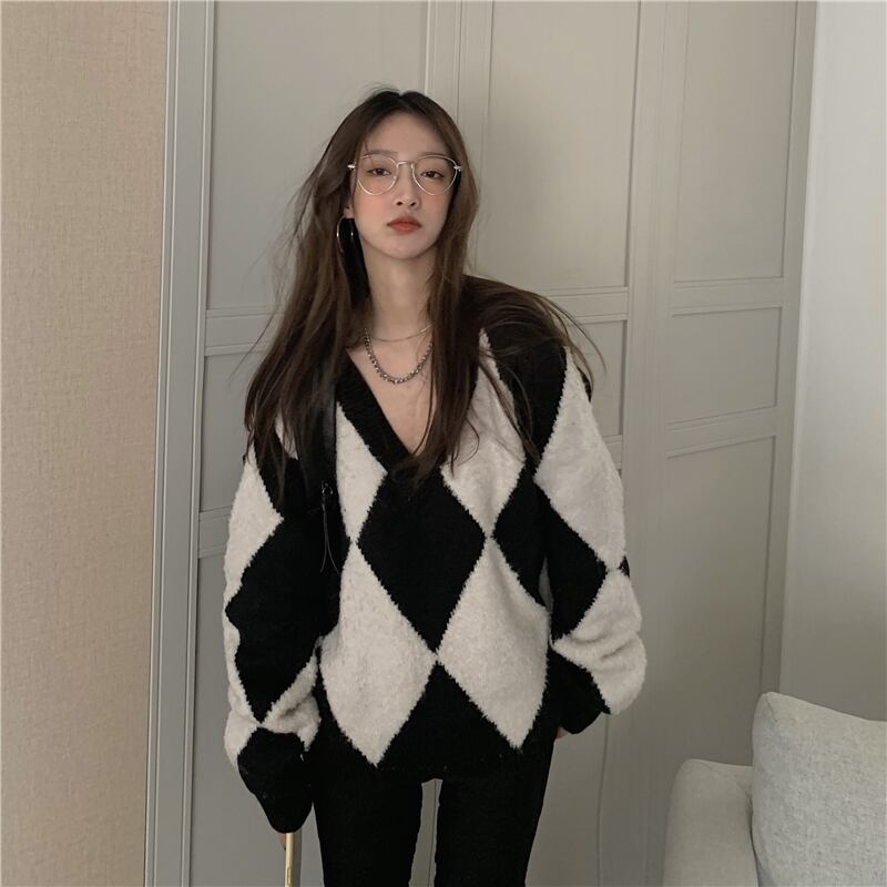 スタンダードルーズニットセーター コート オータムVネックトップス レトロ 秋物 モンロー29665427658