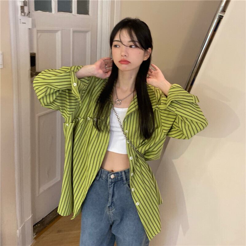 スタイルグリーンストライプスタンダードシャツ ブラウス ジャケット オータムトップス レトロ 秋物 モンロー16795670171