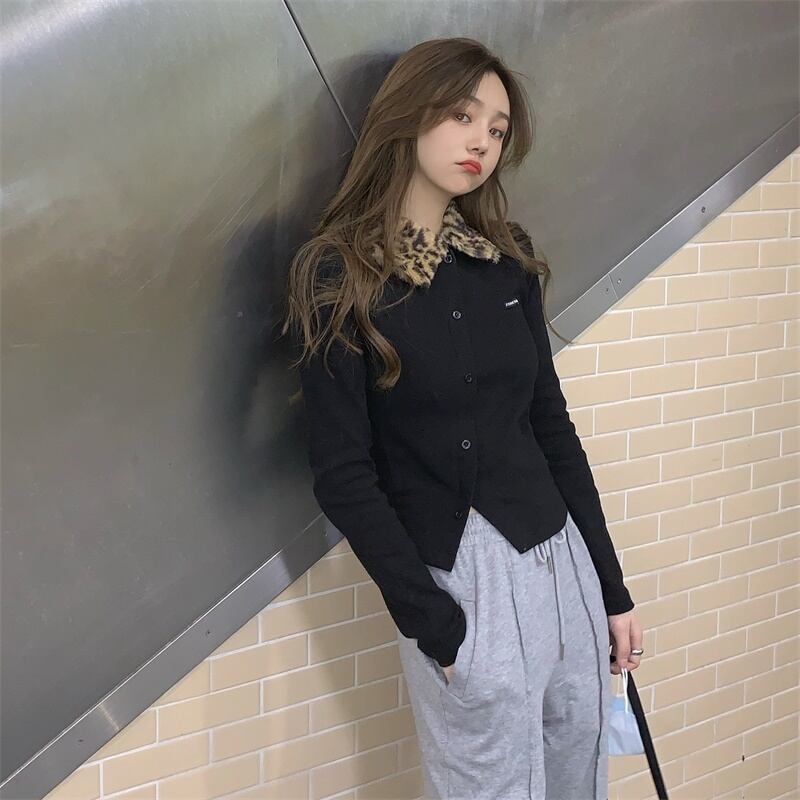 スタンダードレオパードプリント柄カラーニットカーディガンスリムセーター コート オータムトップス レトロ 秋物 モンロー46439100004