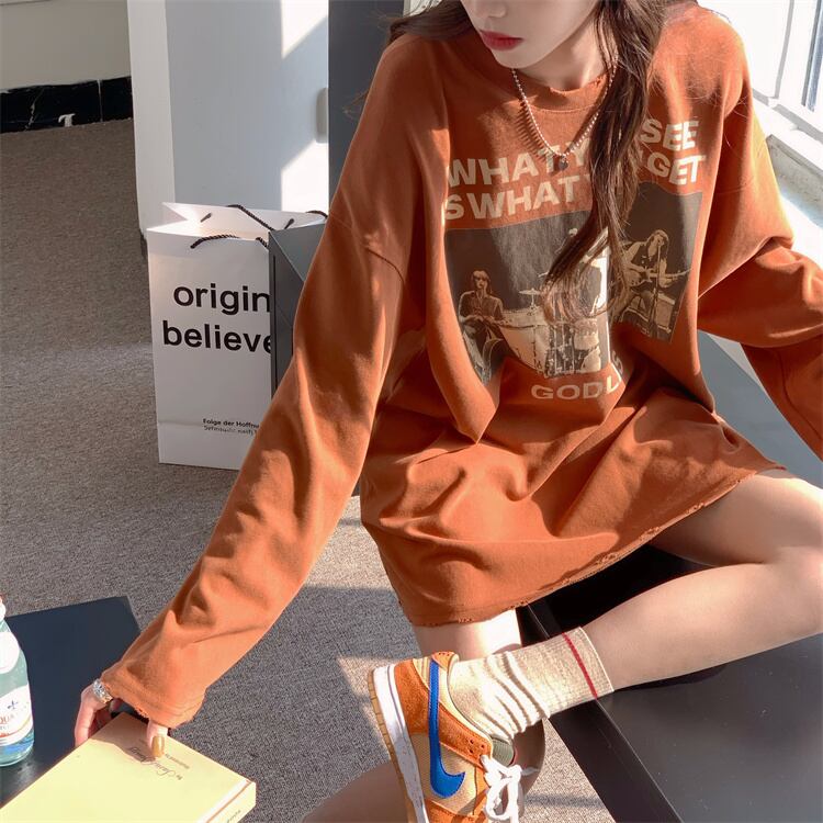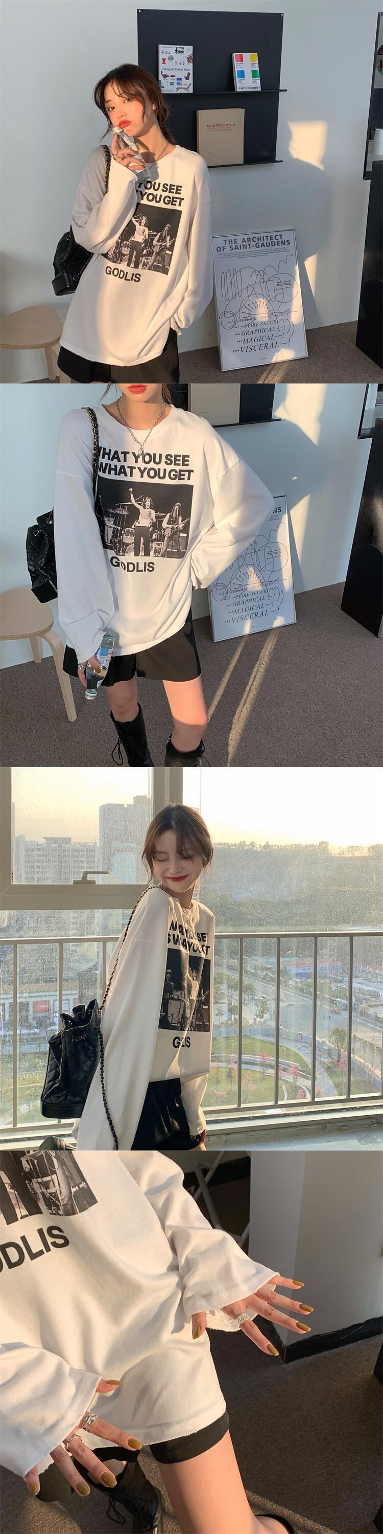 オータムスリムラウンドネックプリントTシャツ ロング 秋物 Oネック モンロー30118477175