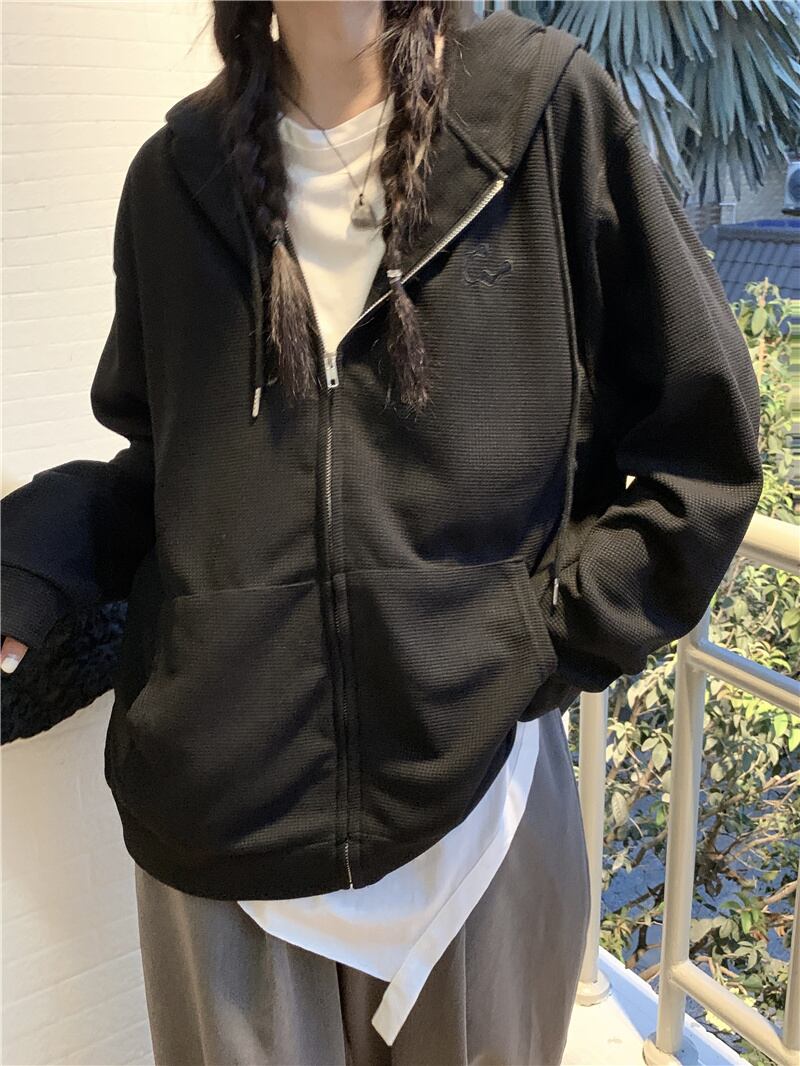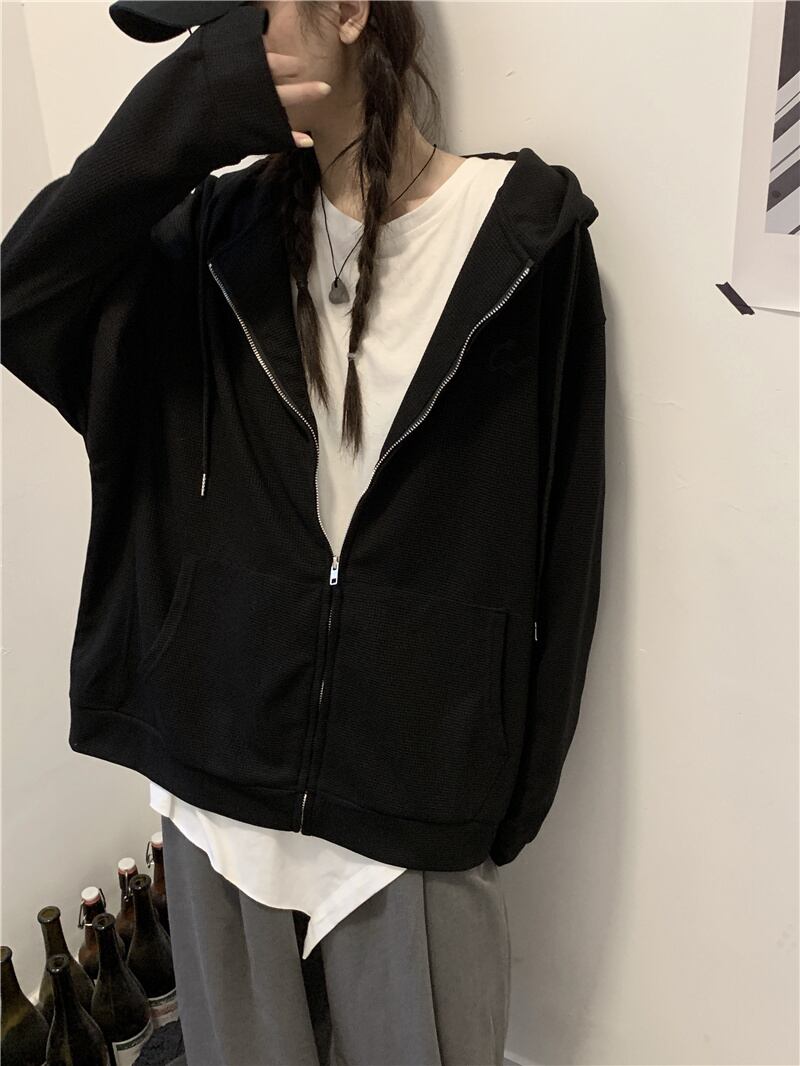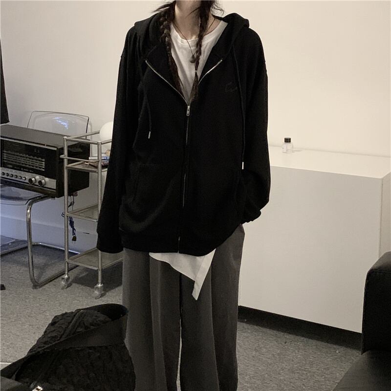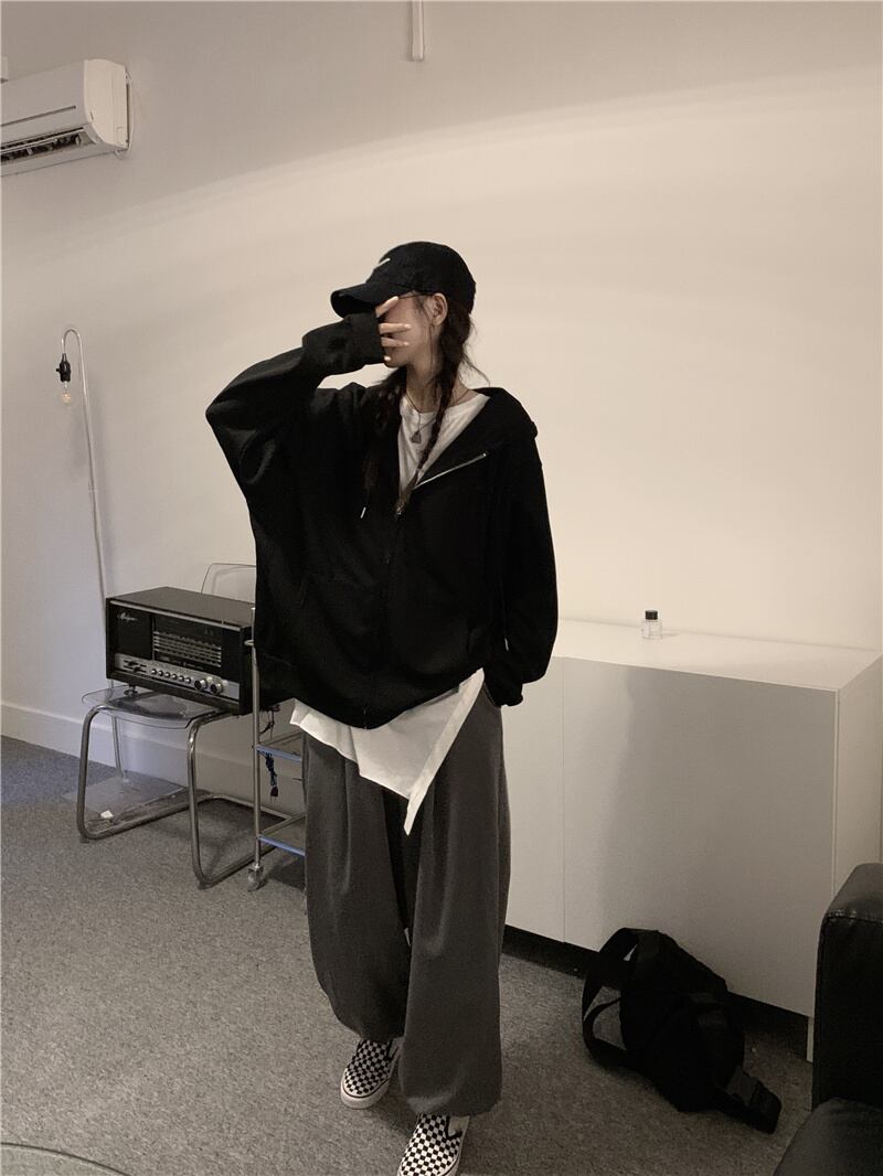 スタイルルーズフードブラックセーター ジャケット オータムカジュアルトップス ロング 秋物 モンロー71719837036