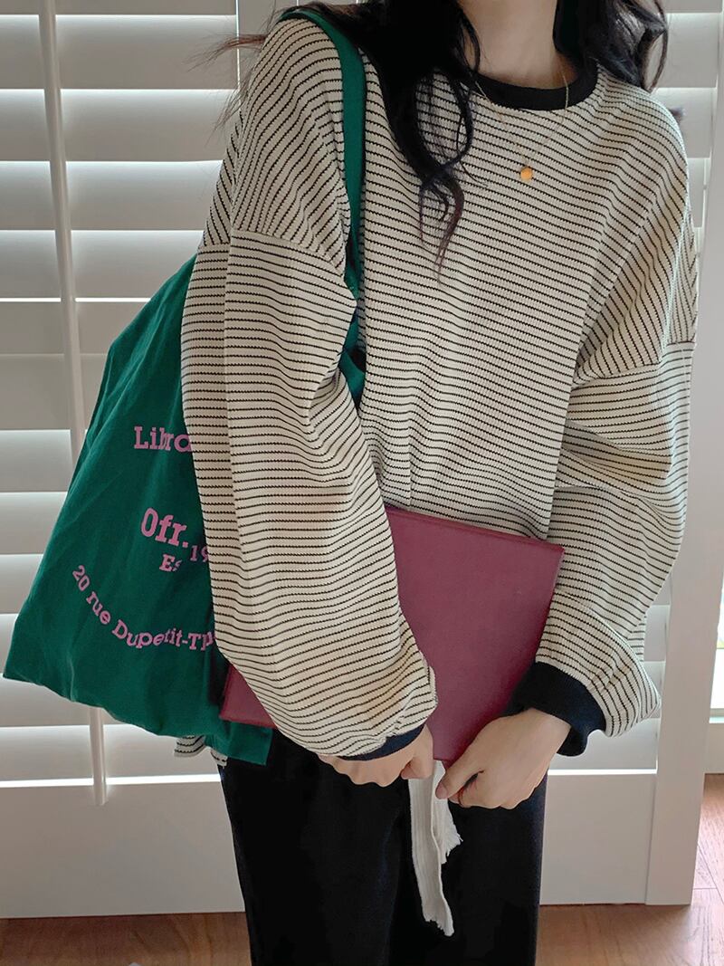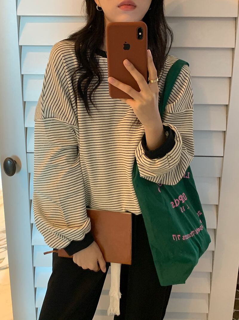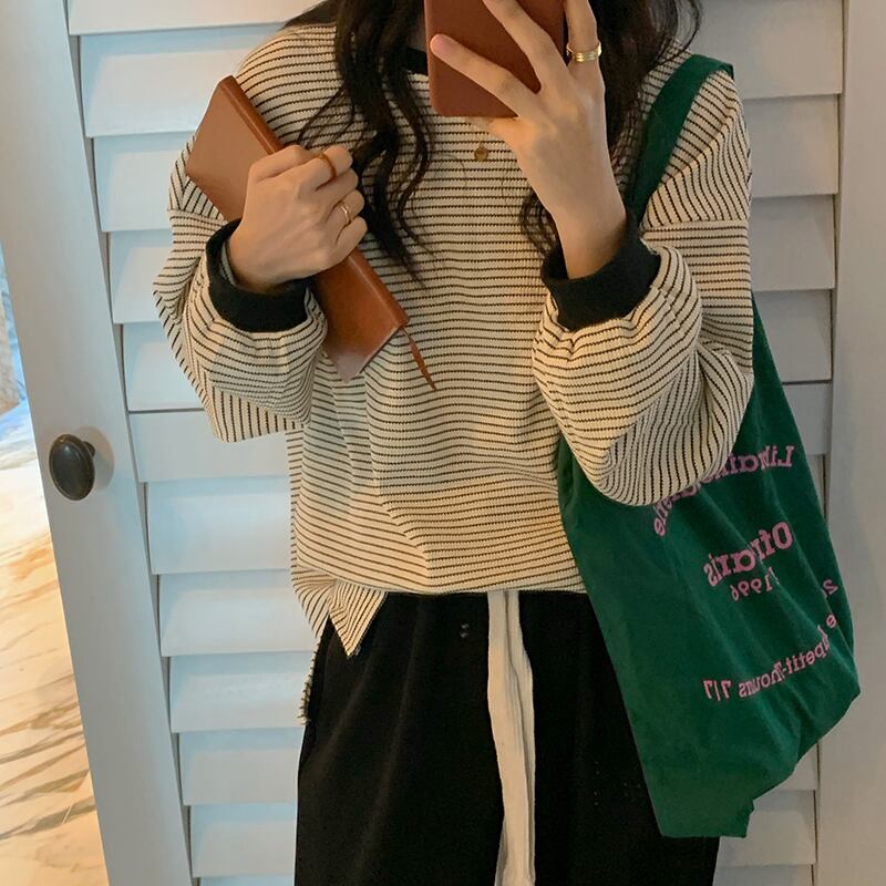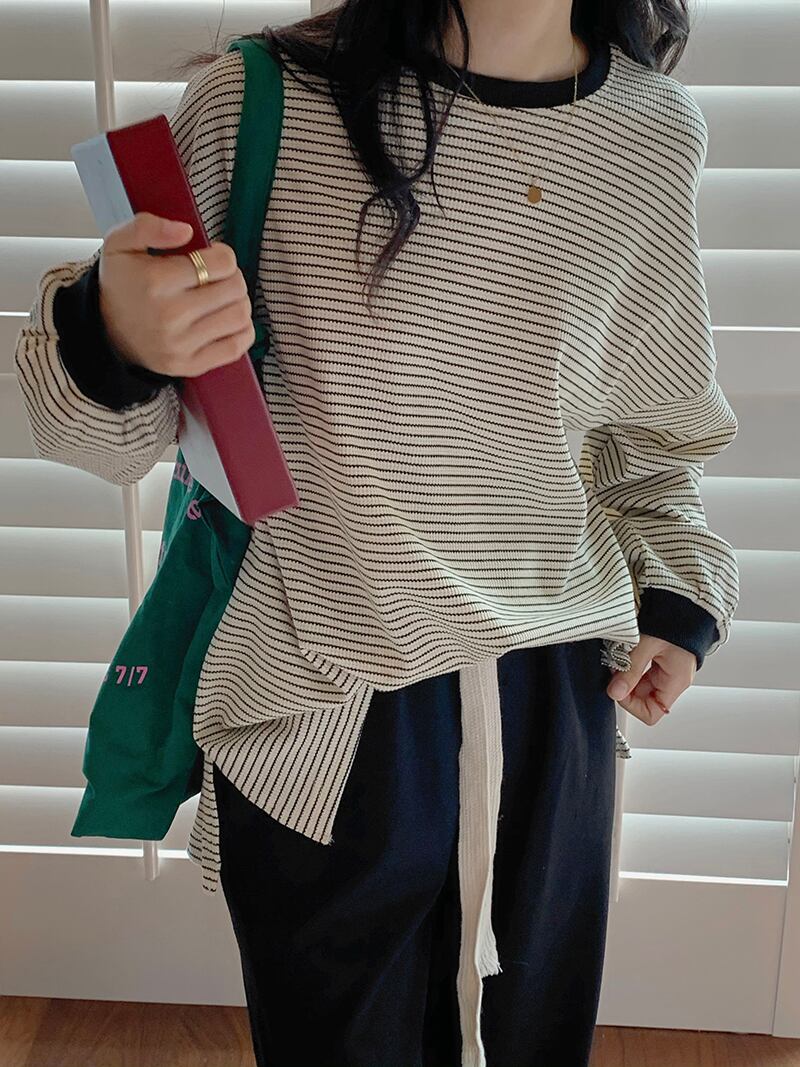 ストライプスタンダードルーズセーター オータムプルオーバー トップス ロング レトロ 秋物 モンロー23215534120